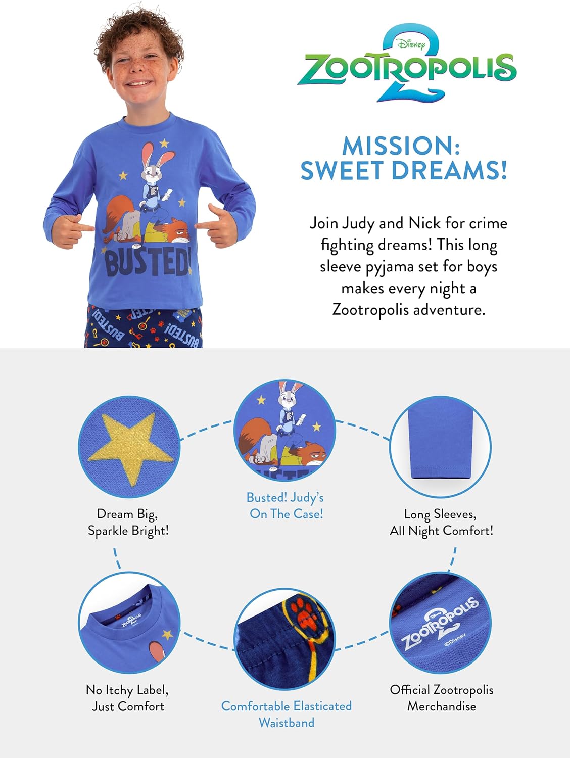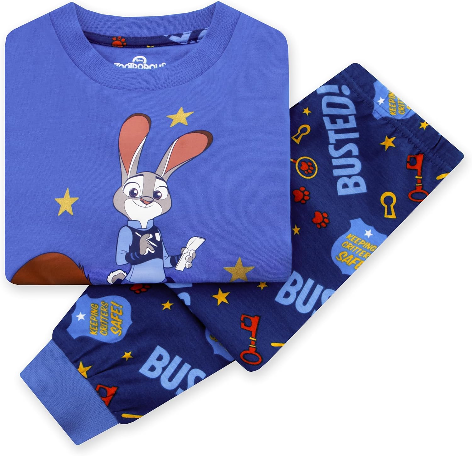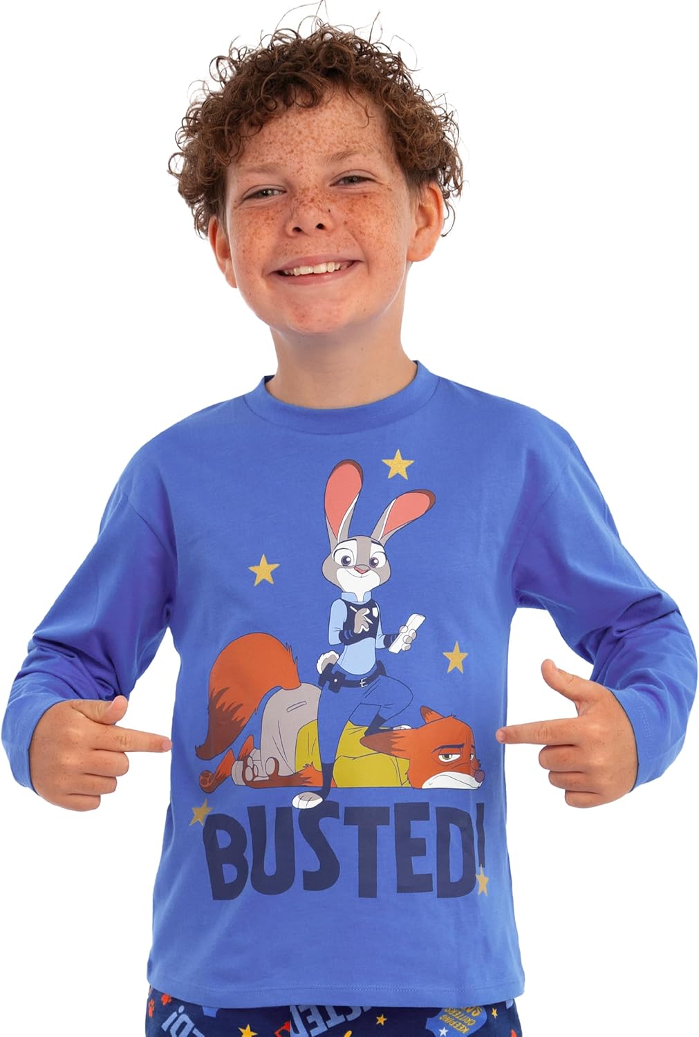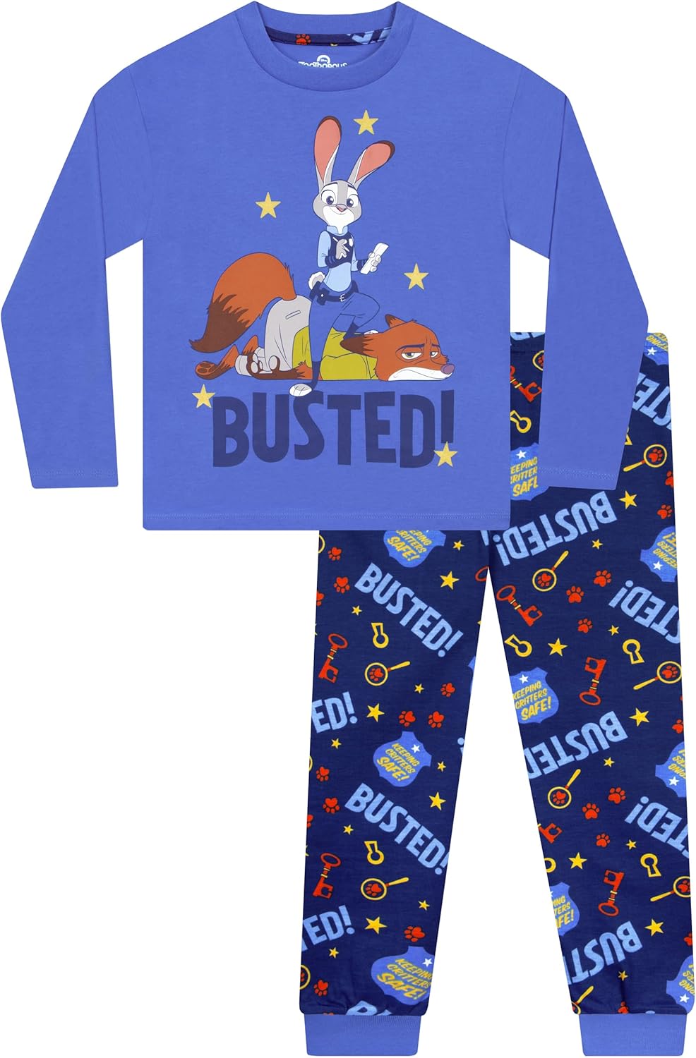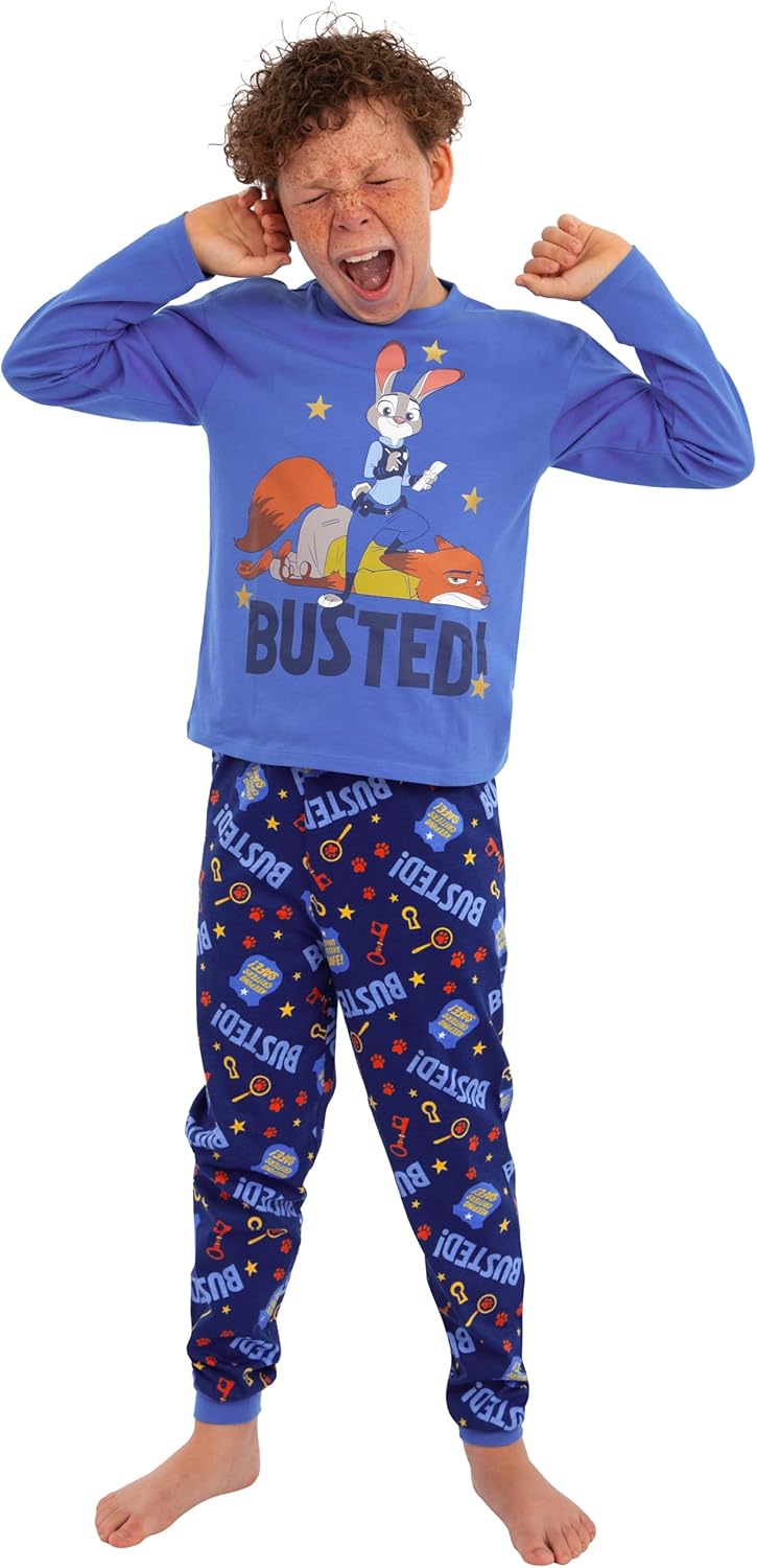 Le pyjama Zootopie se démarque avec ses tons de bleu doux. Le haut à manches longues met en avant Judy Hopps dans une pose triomphante, accompagnée de Nick Wilde. Le texte accrocheur « Busted! » et des étoiles dorées en foil ajoutent une touche scintillante qui ravira les petits admirateurs du film. Cette combinaison de style Disney et d’humour fait de ce pyjama une pièce incontournable pour tous les fans de Zootopie.